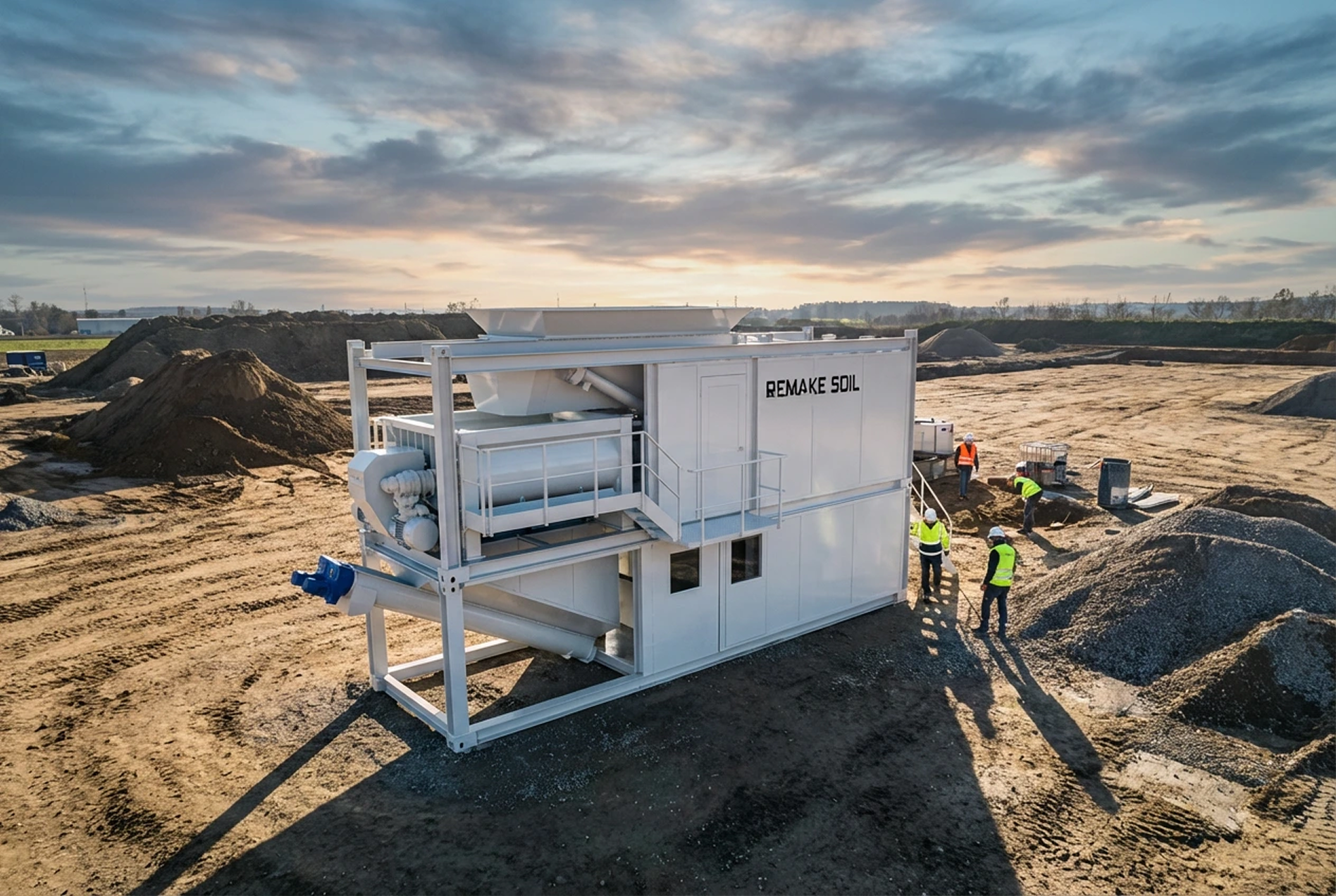 For transport, the plant is divided into two modules and can be flexibly deployed on large construction sites or on ponton-based solutions in port areas.